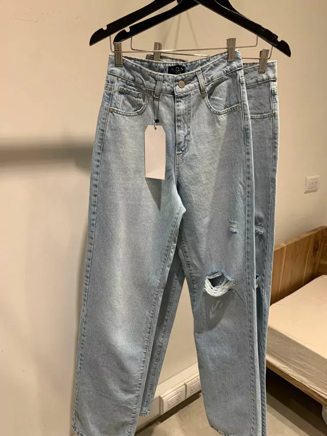 Jean 90s en denim rigido celeste con roturas, 5 bolsillos.
